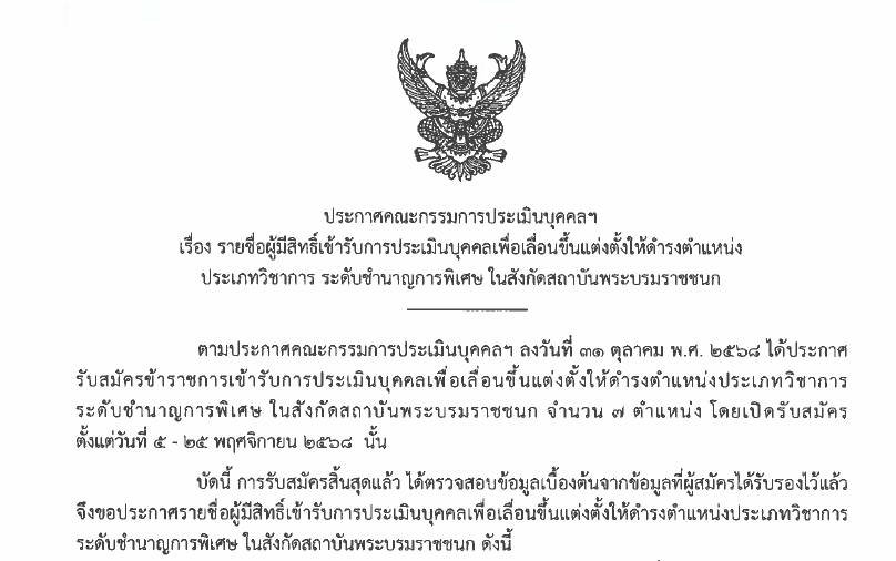 ประกาศคณะกรรมการประเมินบุคคลฯ เรื่องรายชื่อผู้มีสิทธิ์เข้ารับการประเมินบุคคลเพื่อเลื่อนขึ้นแต่งตั้งให้ดำรงตำแหน่งประเภทวิชาการ ระดับชำนาญการพิเศษ ในสังกัดสถาบันพระบรมราชชนก