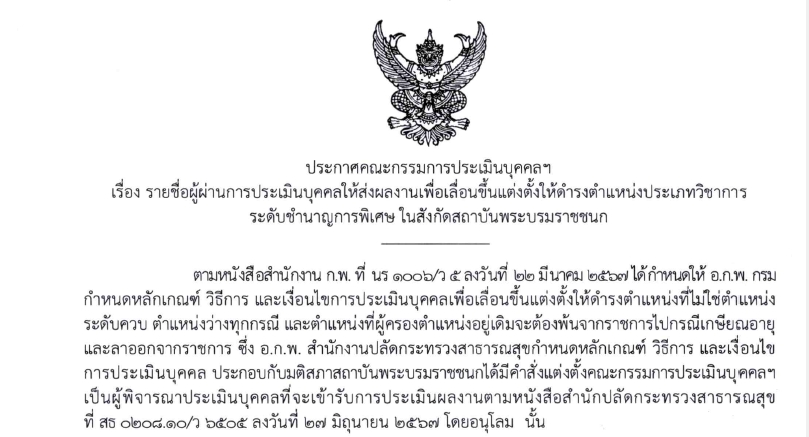 ประกาศคณะกรรมการประเมินบุคคลฯ เรื่อง รายชื่อผู้ผ่านการประเมินบุคคลให้ส่งผลงานเพื่อเลื่อนขึ้นแต่งตั้งให้ดำรงตำแหน่งประเภทวิชาการ ระดับชำนาญการพิเศษ ในสังกัดสถาบันพระบรมราชชนก