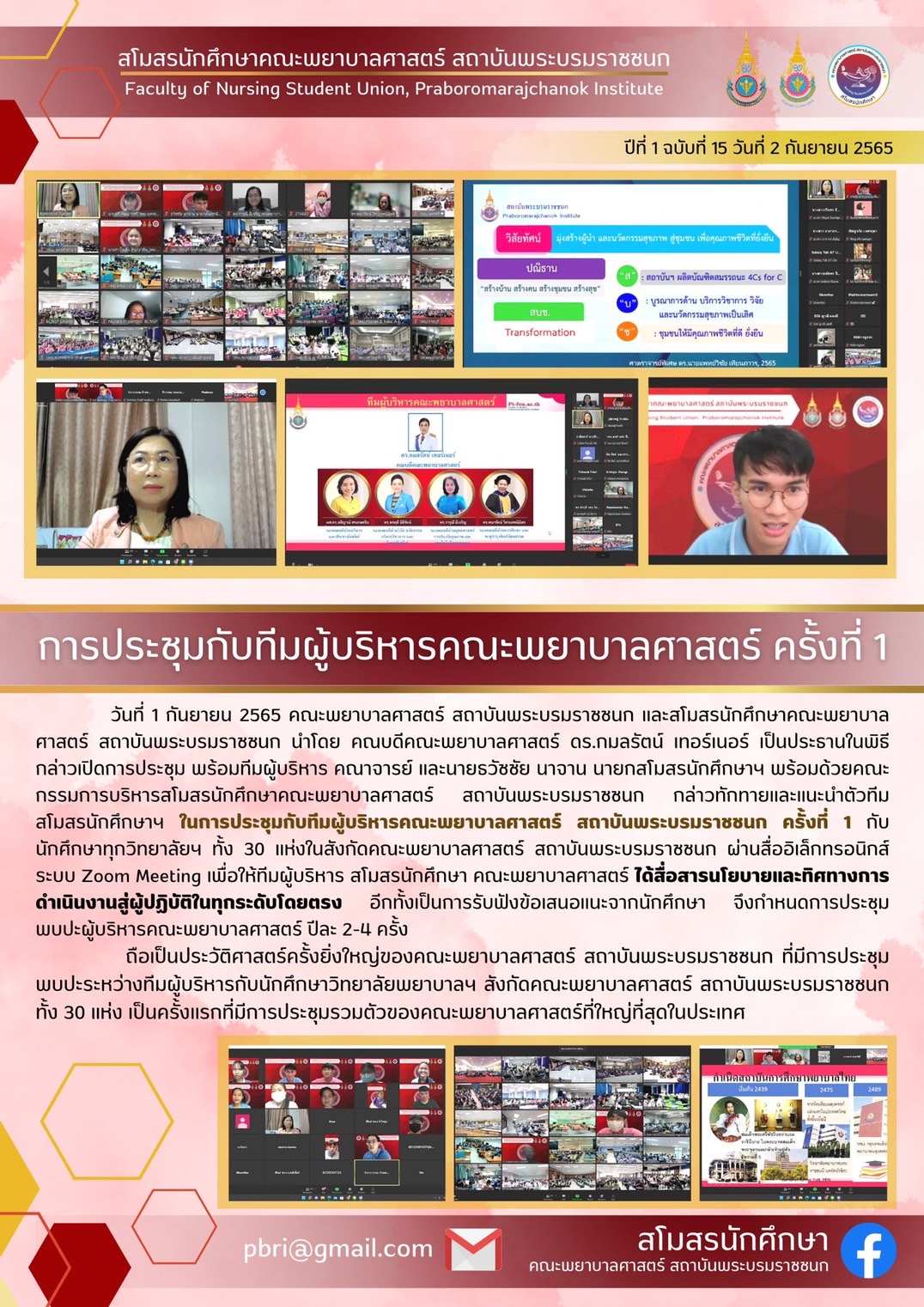 วันที่ 1 กันยายน 2565 คณะพยาบาลศาสตร์ สถาบันพระบรมราชชนก และสโมสรนักศึกษาคณะพยาบาลศาสตร์ สถาบันพระบรมราชชนก นำโดย คณบดีคณะพยาบาลศาสตร์ ดร.กมลรัตน์ เทอร์เนอร์ เป็นประธานในพิธีกล่าวเปิดการประชุม พร้อมทีมผู้บริหาร คณาจารย์ และนายธวัชชัย นาจาน นายกสโมสรนักศึกษาฯ พร้อมด้วยคณะกรรมการบริหารสโมสรนักศึกษาคณะพยาบาลศาสตร์ สถาบันพระบรมราชชนก กล่าวทักทายและแนะนำตัวทีมสโมสรนักศึกษาฯ ในการประชุมกับทีมผู้บริหารคณะพยาบาลศาสตร์ สถาบันพระบรมราชชนก ครั้งที่ 1 กับนักศึกษาทุกวิทยาลัยฯ ทั้ง 30 แห่งในสังกัดคณะพยาบาลศาสตร์ สถาบันพระบรมราชชนก ผ่านสื่ออิเล็กทรอนิกส์ระบบ Zoom Meeting เพื่อให้ทีมบริหาร สโมสรนักศึกษา คณะพยาบาลศาสตร์ ได้สื่อสารนโยบายและทิศทางการดำเนินงานสู่ผู้ปฏิบัติในทุกระดับโดยตรง อีกทั้งเป็นการรับฟังข้อเสนอแนะจากนักศึกษา จึงกำหนดการประชุมพบปะผู้บริหารคณะพยาบาลศาสตร์ ปีละ 2-4 ครั้ง