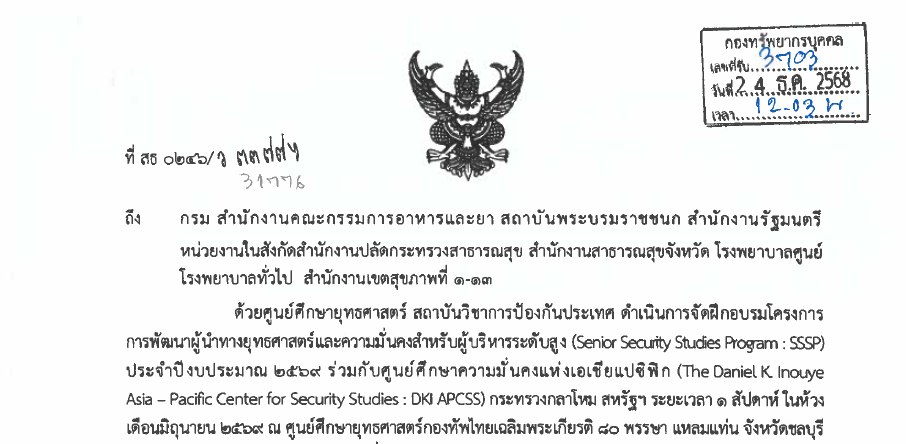 ขอเรียนเชิญเข้าร่วมอบรมโครงการการพัฒนาผู้นำทางยุทธศาสตร์และความมั่นคงสำหรับผู้บริหารระดับสูง